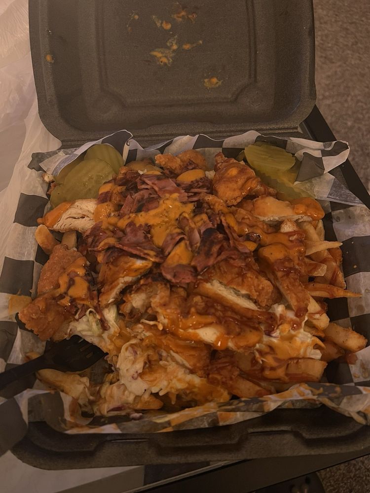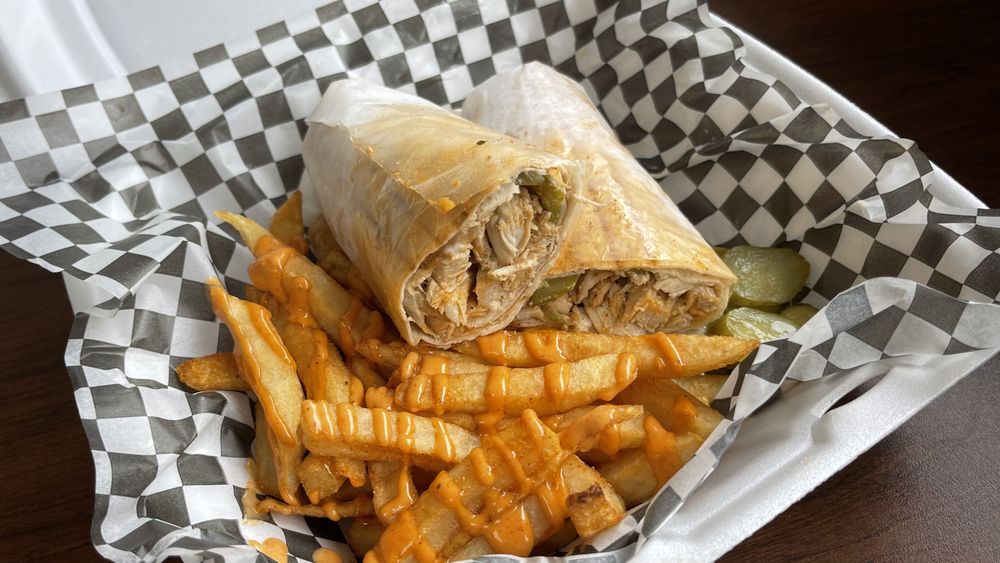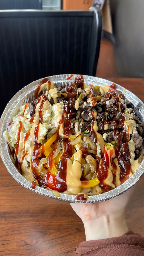 Experience a flavorful mix of tender beef, jalapeños, sautéed onions, mushrooms, peppers, coleslaw, rice, BBQ sauce, and spicy ranch!