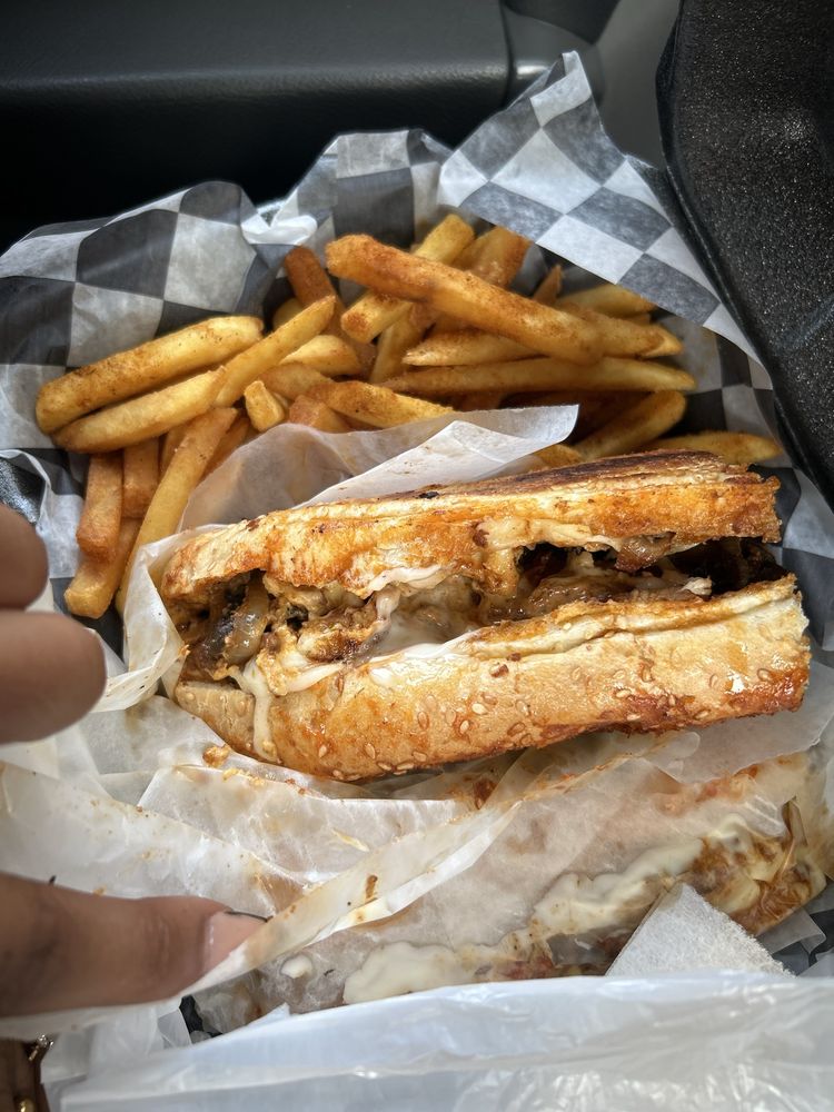Sliced beef, grilled mushrooms, onions, and peppers, topped with cheese, mayo, and garlic aioli