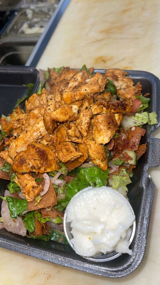 Rice, mixed fattoush, humus, olives, sauteed nuts, pomegranate molasses and garlic lemon vinaigrette